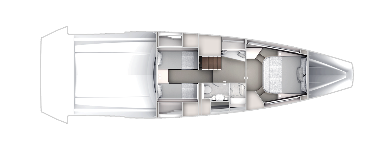 Cabina: cabina armatoriale, cabina doppia, dinette e bagno con doccia separata. Coperta: ampio prendisole a prua, zona living a poppa con tavolo e sedute convertibili.